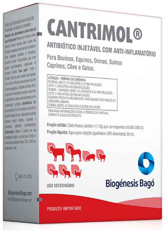 Cantrimol é indicado para prevenção e tratamento das principais infecções bacterianas do sistema gastrintestinal, respiratório, geniturinário, muscular, articular e de pele causadas por bactérias gram-positivas e gram-negativas que acometem os bovinos, ovinos, caprinos, suínos, equinos, causadas ou associadas a microrganismos sensíveis à terapia por penicilinas / estreptomicinas, tais como:
