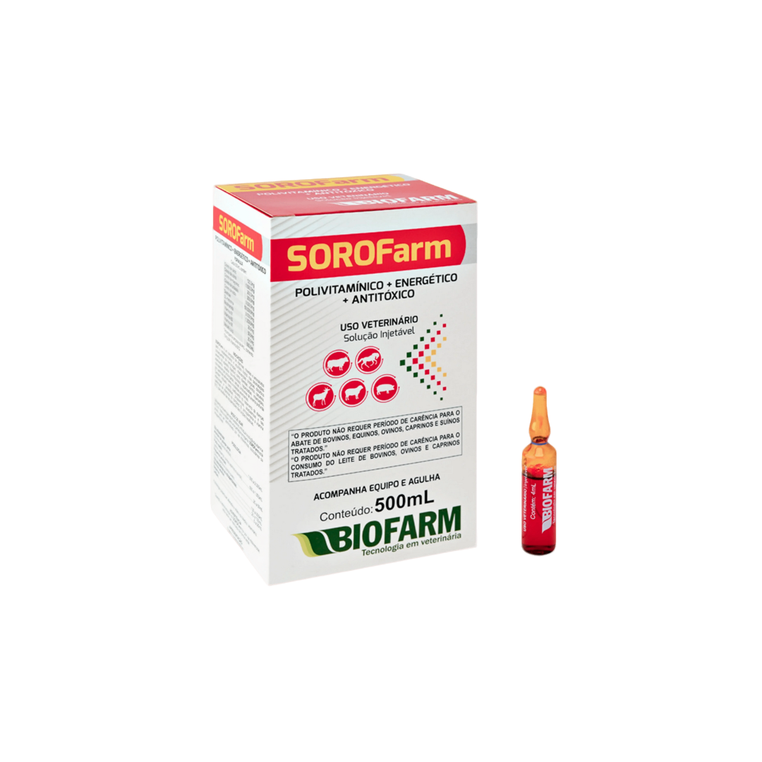 SOROFarm é um composto de vitaminas, minerais e aminoácidos para o restabelecimento e o equilíbrio hídrico nas desidratações consequentes de hemorragias, intervenções cirúrgicas, distúrbios severos do aparelho digestivo como: diarréias e vômitos, caquexia, acetonemia, estados toxi-infecciosos, hepatopatias, intoxicações, convalescenças prolongadas, cetose, síndromes de anemia profunda por carências alimentares e moléstias anemiantes. Também indicado como coadjuvante no tratamento de doenças infecciosas e parasitárias, piroplasmose, anaplasmose e nas carências de vitaminas do complexo B, principalmente a vitamina B12 que auxilia nas recuperações das funções hepáticas.